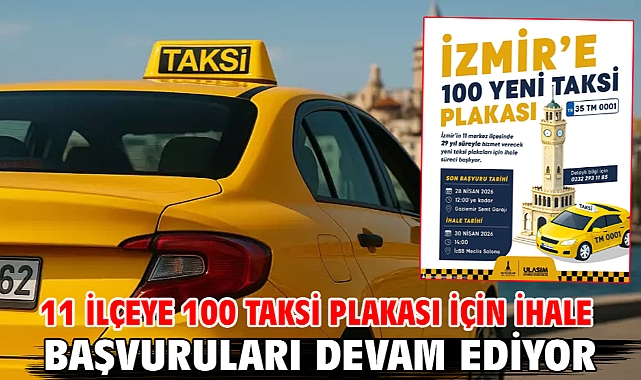 İzmir Büyükşehir Belediyesi’nin; Balçova, Bayraklı, Bornova, Buca, Çiğli, Gaziemir, Güzelbahçe, Karabağlar, Karşıyaka, Konak ve Narlıdere olmak üzere kent merkezindeki 11 ilçede 29 yıl süreyle hizmet verecek 100 taksi plakası için düzenlediği ihale 30 Nisan 2026 Perşembe günü saat 14.00’te Meclis Salonu’nda yapılacak. İhaleye katılmak isteyenler, 28 Nisan 2026 Salı günü saat 12.00’ye kadar başvurularını Gaziemir Semt Garajı’nda bulunan Toplu Ulaşım Hizmetleri Şube Müdürlüğü Ruhsat Birimi’ne yapabilecek.