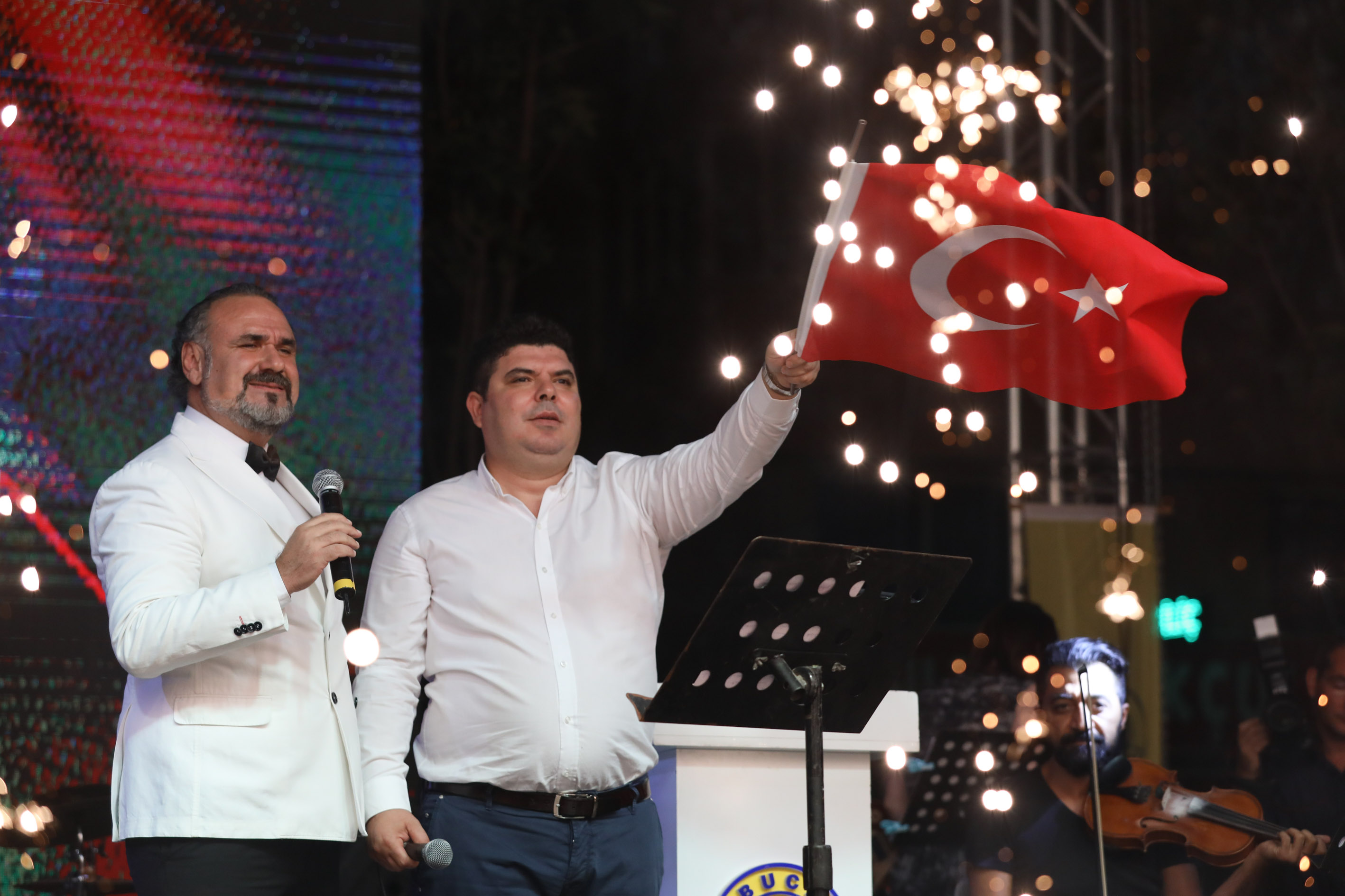 BİN METRELİK DEV BAYRAKLI KORTEJİN ARDINDAN AYSEV KONSERİ Kutlamalar Buca Belediye Hizmet Binası’nın önünde toplanan Bucalılar meşaleler ve marşlar eşliğinde yürüyüşe başlandı. Menderes Caddesi üzerinden Kasaplar Meydanı’na doğru ilerleyen kortejde, Buca Belediye Başkanı Av. Erhan Kılıç ile birlikte bir kilometrelik dev Türk bayrağı açıldı.