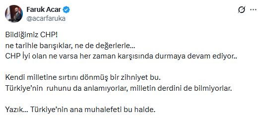 AK Parti Genel Sekreteri Eyyüp Kadir İnan, sanal medya hesabından yaptığı açıklamada, "Siyasetinizi çocukların masumiyeti üzerinden yapacak kadar mı tükendiniz? Çocuklara sırtını dönen bir yapının, bu milletin geleceğine yüzünü dönmesi imkansızdır" dedi.'MİLLETİNE SIRTINI DÖNMÜŞ ZİHNİYET'AK Parti'li Faruk Acar ise sanal medya hesabından, "Bildiğimiz CHP; ne tarihle barışıklar, ne de değerlerle. CHP, iyi olan ne varsa her zaman karşısında durmaya devam ediyor. Kendi milletine sırtını dönmüş bir zihniyet bu. Türkiye’nin ruhunu da anlamıyorlar, milletin derdini de bilmiyorlar. Yazık, Türkiye’nin ana muhalefeti bu halde" açıklaması yaptı. (DHA)