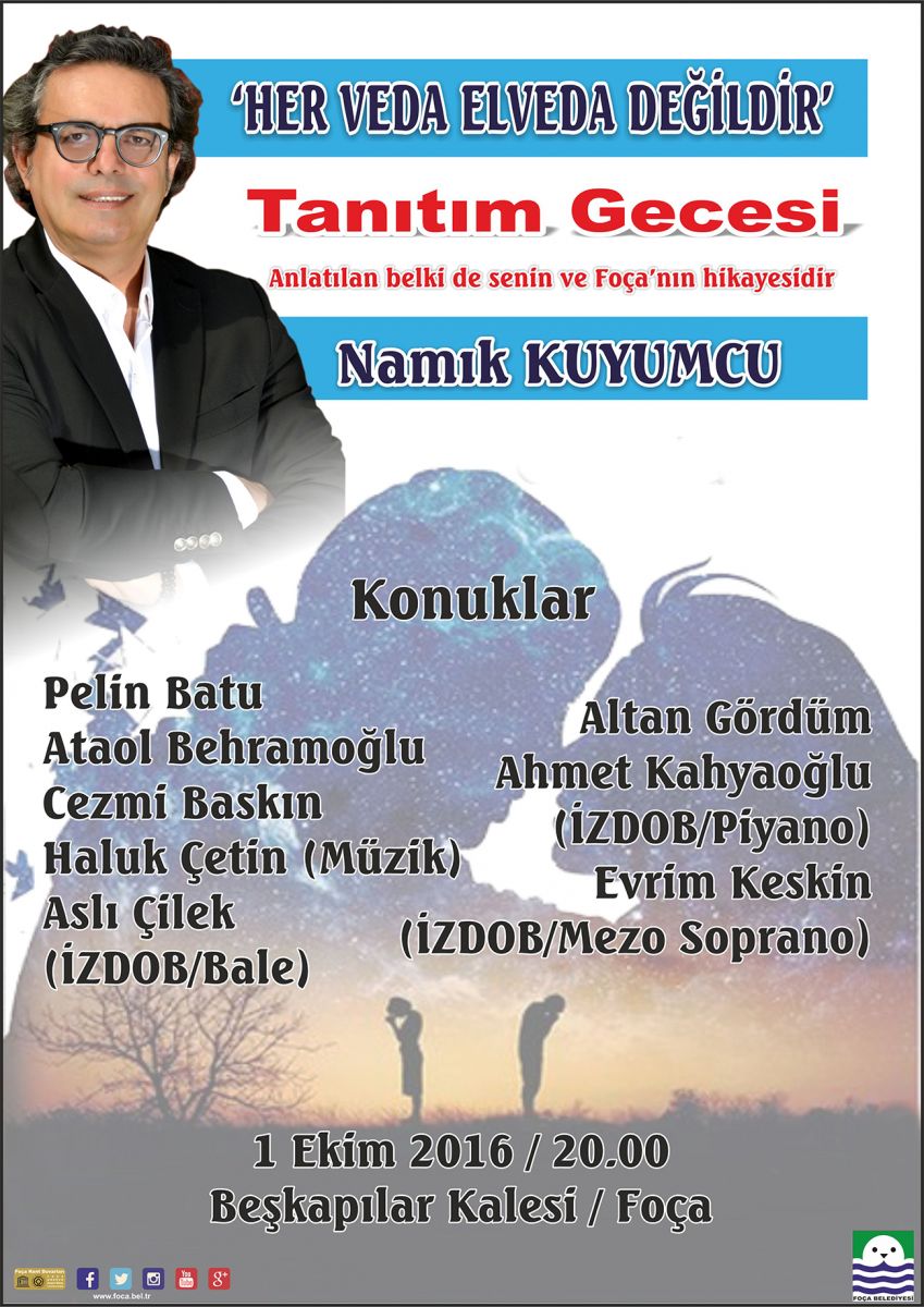 Yazar Namık Kuyumcu’nun, ‘Her Veda Elveda Değildir’ isimli yeni romanı için Foça Beşkapılar Kalesi’nde tanıtım gecesi düzenlendi.Foça Belediyesi’nce düzenlenen tanıtım gecesine, Namık Kuyumcu’nun sanatçı dostları da katkıda bulunacak. Pelin Batu, Ataol Behramoğlu, Cezmi Baskın, Haluk Çetin(müzik), Aslı Çelik (İZDOB/Bale), Altan Gördüm, Ahmet Kahyaoğlu (İZDOB/Piyano) ve Evrim Keskin (İZDOB/Mezo Soprano) tanıtım gecesine konuk olacaklar.Namık Kuyumcu - ‘Her Veda Elveda Değildir’ romanı tanıtım gecesi, 1 Ekim 2016 Cumartesi akşamı, saat 20.00’de başlayacak.