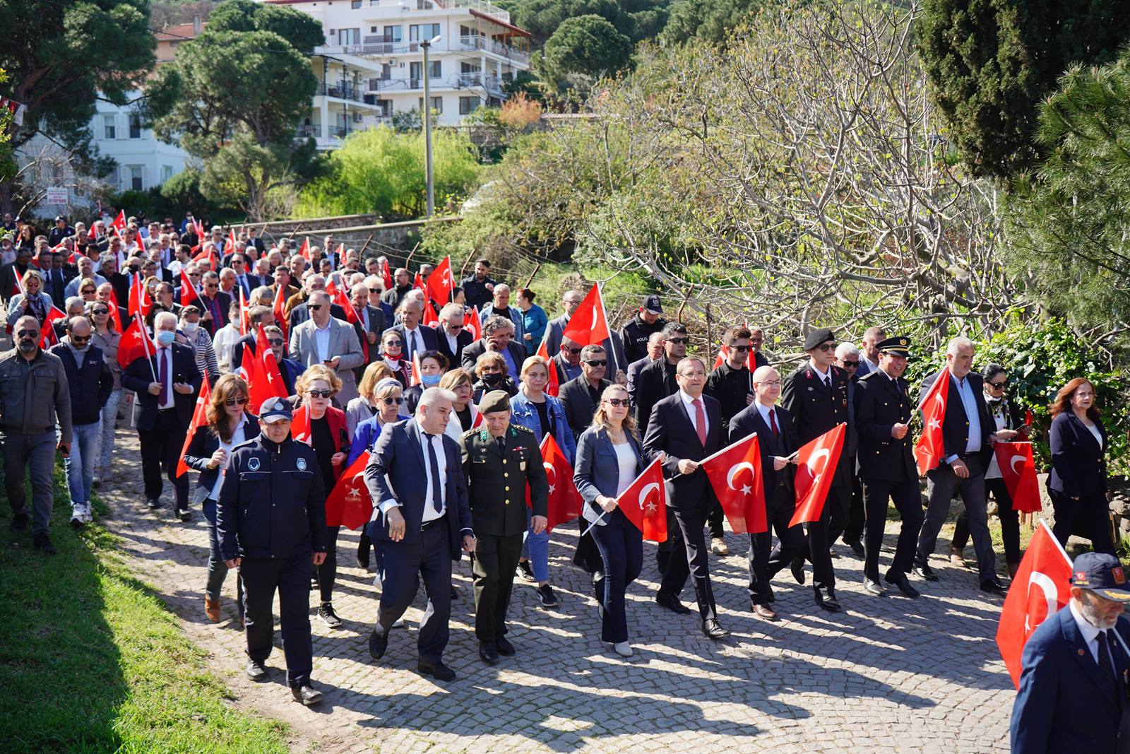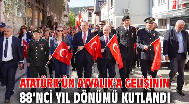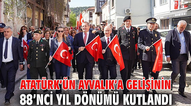 Program, Ayvalık Karayolları 29'uncu Şube Şefliği bahçesinden başladı. Atatürk'ün ilçeye giriş yaptığı güzergah üzerinden gerçekleştirilen yürüyüşe; Ayvalık Kaymakamı Hasan Yaman, Ayvalık Belediye Başkanı Mesut Ergin, Garnizon Komutan vekili Piyade Albay Ufuk Çırağ, Ayvalık İlçe Jandarma Komutanı Yüzbaşı Onur Yakan, Ayvalık Cumhuriyet Başsavcısı Necati Kayaközü, İlçe Emniyet Müdürü Turgut Coşkun, gaziler ve şehit aileleri, siyasi parti ve sivil toplum örgütlerinin temsilcileriyle öğrenciler katıldı. Cumhuriyet Meydanı’nda gerçekleştirilen tören, saygı duruşu ve İstiklal Marşı ile devam etti. Öğrenciler Atatürk’e armağan ettiği şiirlerin okunmasının ardından, çelenk takdimleri ve vatandaşların Atatürk anıtına çiçek sunumunun ardından Ayvalık Belediye Başkanı Mesut Ergin yaptığı konuşmada, 88 yıl önce, bugün Ayvalık’a gelip bu toprakları ziyaret eden Ulu Önder Mustafa Kemal Atatürk’ün güzergâhından yürüyerek halkın karşısına gelmekten duyduğu mutluluğu dile getirdi.