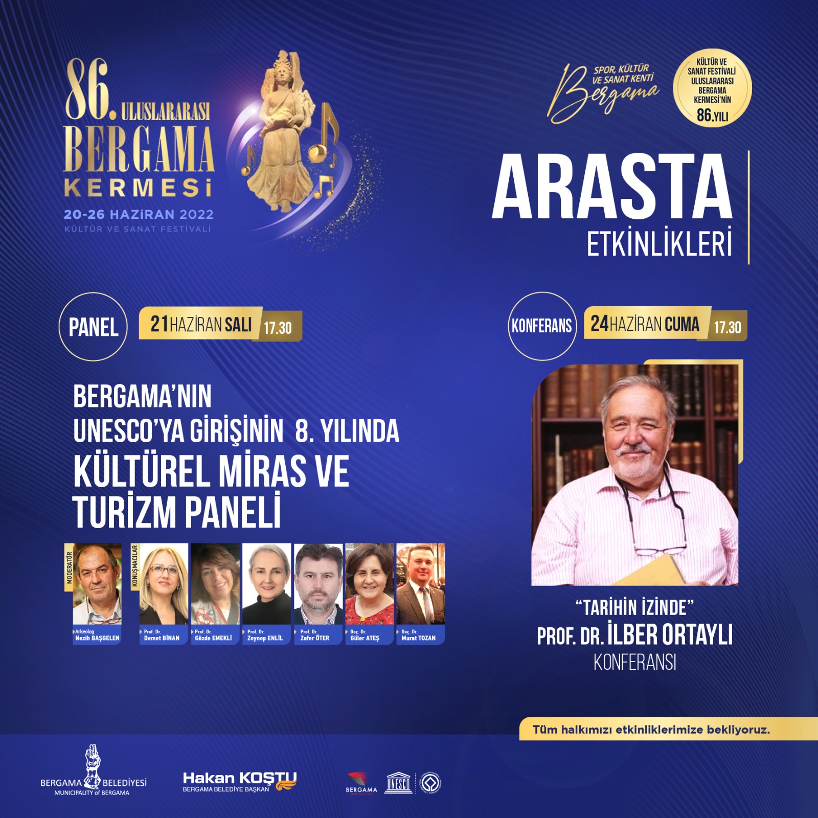 ÜNLÜLER GEÇİDİ BERGAMA’DABergama’nın yetiştirdiği dünyaca ünlü klarnet virtüözü Hüsnü Şenlendirici başta olmak üzere Sertap Erener, Melek Mosso, Öykü Gürman, Kubat, Tuğba Yurt, Ahmet Şafak, Mustafa Cihat Kılıç, Hale Yamaner Uluslararası Bergama Kermesi’nde sahne alacak. Ünlü tarihçi Prof. Dr. İlber Ortaylı “Tarihin İzinde” konferansı ile sevenleri ile Arasta’da buluşacak. İstanbul Devlet Tiyatrosu’nun da “80 Günde Devri Alem” oyunu ile sahne alacağı kermeste 7 gün süresince yurtiçi ve yurtdışından halk oyunları gösteri grupları, yerel sanatçıların sahne ve konserleri, sergi, kültürel ve sportif etkinlikler yer alacak.