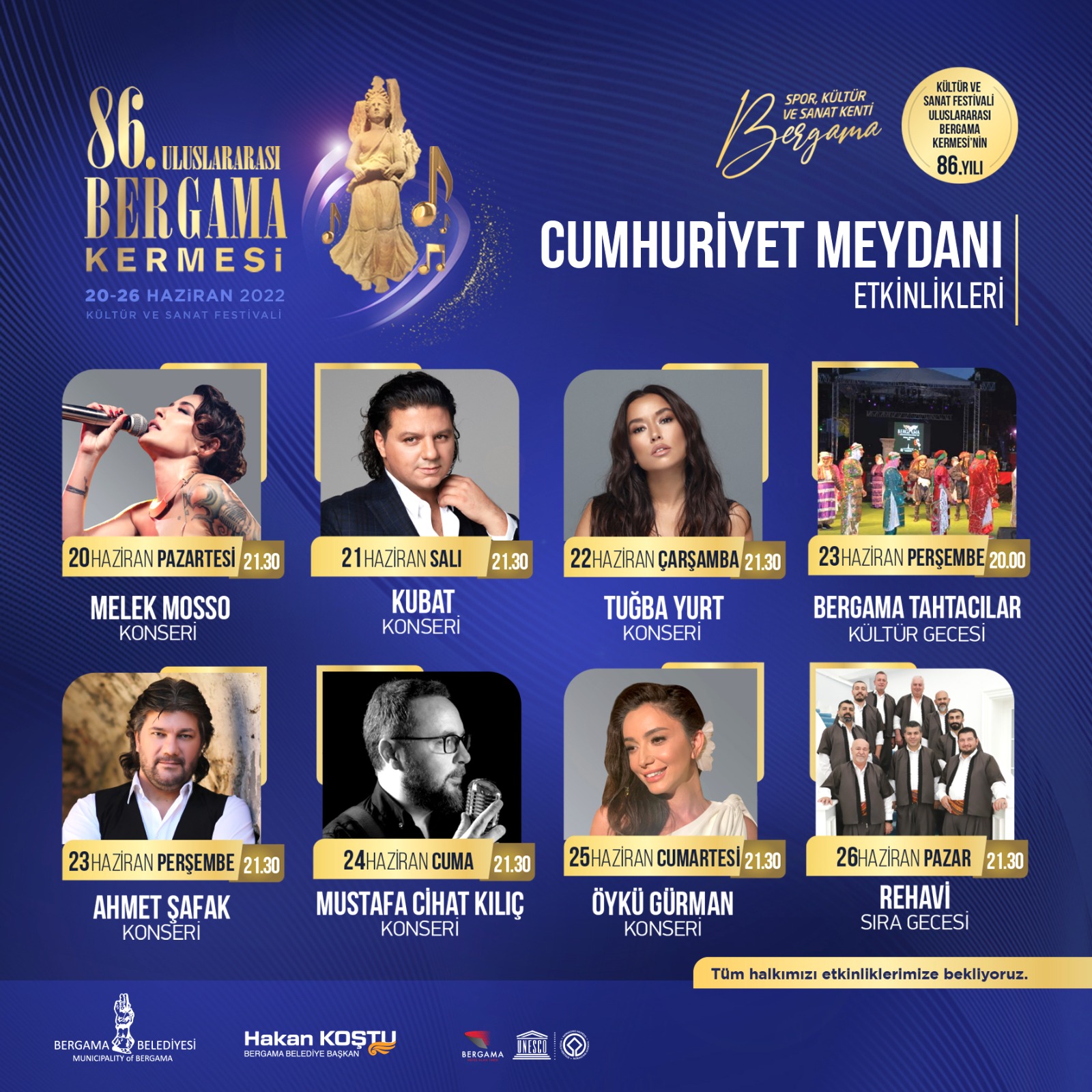 Türkiye’nin ilk yerel festivali özelliğindeki Uluslararası Bergama Kermesi için çok zengin içerikli bir program hazırlandığını söyleyen Belediye Başkanı Koştu, “Gazi Mustafa Kemal Atatürk’ün önerisi ile 86 yıldır aralıksız kutlanmaya başlanan festivalimiz için hazırlıklarımızı tamamladık. Son yılların en içeriği zengin festival programını hazırladık. Amacımız, Unesco Dünya Kültür Mirası Listesi’nin 999. üyesi olan Bergama’mızın tarihi, sosyal ve kültürel değerlerine dikkat çekmek. Bergama Kermesi ile ilçemize gelen herkesi geleneksel Bergama konukseverliği ile tanıştırmak istiyoruz” dedi. 20-26 Haziran tarihlerinde Asklepion Antik Tiyatro, Cumhuriyet Meydanı, Arasta, Kültür Merkezi ve Kozak Yaylası’nda düzenlenecek olan etkinliklerde Türkiye’nin gözde sanatçıları sahne alacak.
