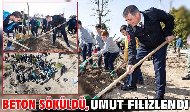 İzmir Büyükşehir Belediye Başkanı Dr. Cemil Tugay’ın Kültürpark’ta başlattığı gençleştirme çalışmaları kapsamında beton alanlar yeşil dokuya dönüşmeye devam ediyor. İzmir Büyükşehir Belediyesi Park ve Bahçeler Dairesi Başkanlığı tarafından yürütülen çalışmalar kapsamında Atlas Pavyonu’nun kuzeyinde yer alan yaklaşık 4 bin 300 metrekarelik kilit parke taş döşenen beton alanın yeşil alana dönüştürülmesi için çalışma yürütüldü. Alan üzerindeki kilit parke taşlarının sökülmesinin ardından zemin, ağaçlandırmaya uygun hale getirildi. Çalışmalar kapsamında Başkan Dr. Cemil Tugay, Konak Salih İşgören İlkokulu öğrencileri ile alan için hazırlanan ağaçları toprakla buluşturdu. Etkinlikte Başkan Tugay’a miniklerin yanı sıra İzmir Büyükşehir Belediyesi Genel Sekreter Yardımcısı Halit Çelik ve Büyükşehir bürokratları, doğa dernekleri ve 7’den 70’e İzmirliler katıldı.