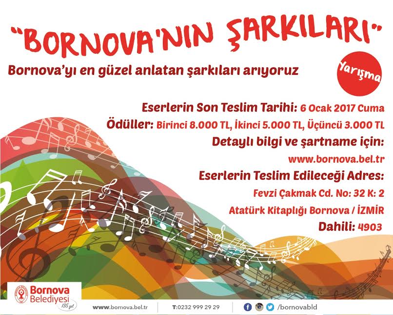 Bornova Belediyesi, kent bilincini geliştirmek ve Bornova’yı anlatan ölümsüz bir eser ortaya çıkarmak amacıyla “Bornova’nın Şarkıları” adlı bir yarışma düzenliyor. Her yaştan besteci, söz yazarı ve aranjörün katılabileceği yarışmaya başvurular başladı. Katılımcıların en fazla iki eserle katılabileceği yarışmanın son başvuru tarihi ise 6 Ocak 2017 olarak belirlendi. Birinciye 8 bin, ikinciye 5 bin üçüncüye ise 3 bin Türk Lirası’nın ödül olarak verileceği organizasyonda Jüri Özel Ödülü’nün yanı sıra 7 adet mansiyon ödülü de verilecek.
