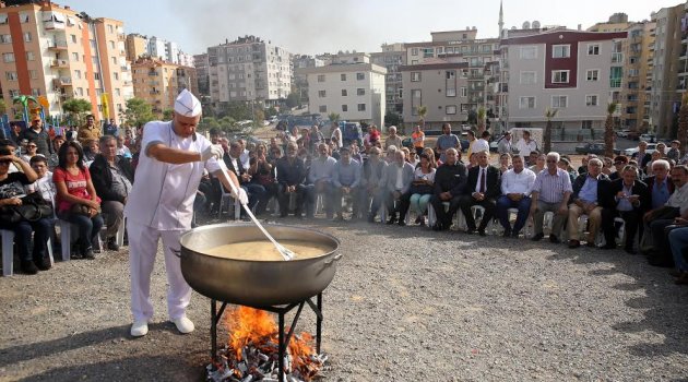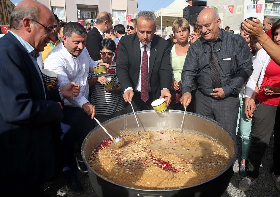 Alanda yakılan ateş üstünde dev bir kazanda pişirilen aşure, hep bir ağızdan okunan aşure duası ile karılmaya başlandı. Dostluk, barış ve kardeşlik için el ele vererek karıştırılan aşure Buca Belediyesi ikram araçlarının da desteğiyle bin 500 kişiye dağıtıldı.