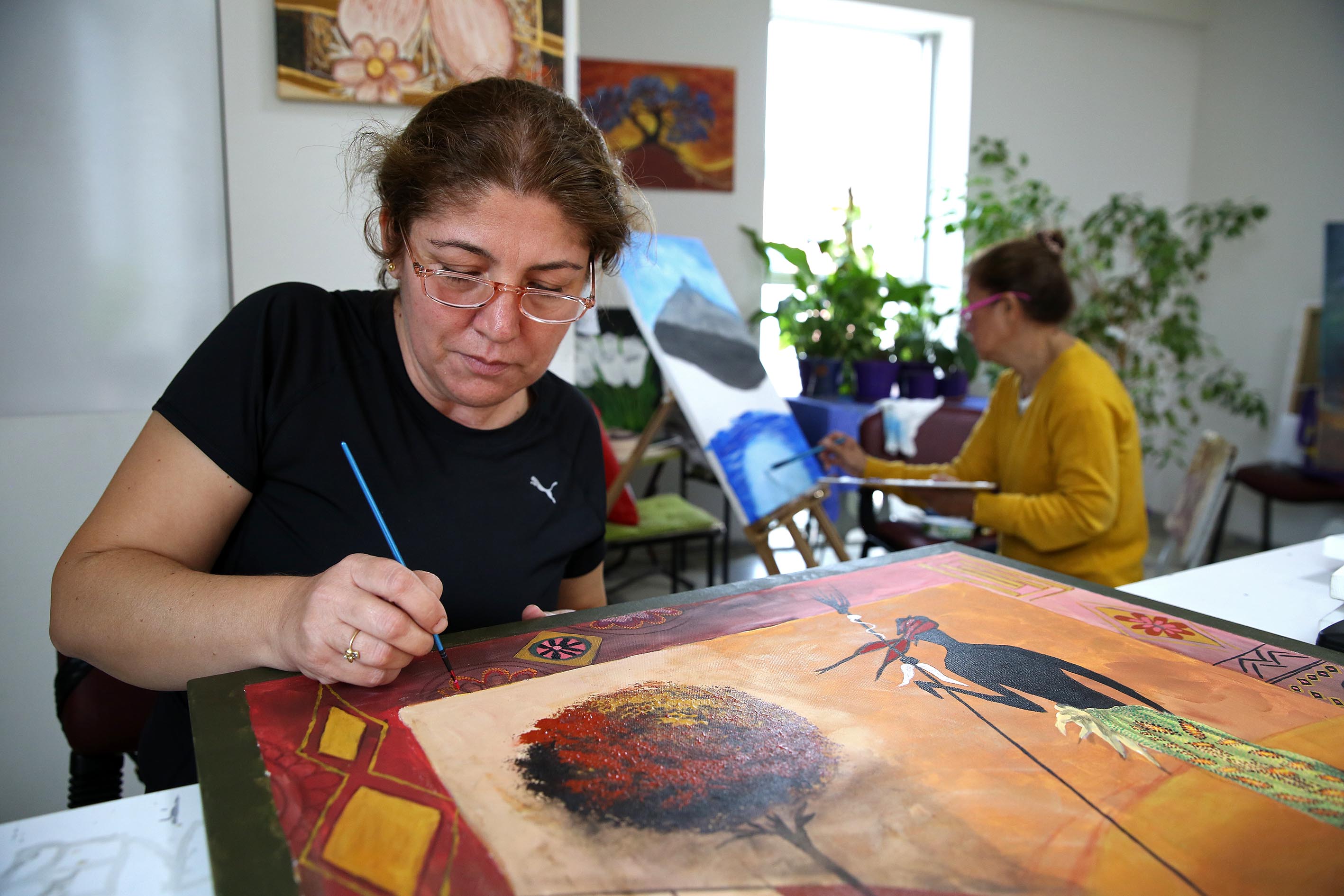 Haftanın 5 günü Semt Evi’nde açılan ve uzman eğitmenler tarafından verilen ücretsiz resim kursuna gelen kadınlar yepyeni bir sanat öğrenmenin, gecikmiş hayallerini gerçekleştirmenin yanında kendi deyimleriyle huzuru ve mutluluğu buluyor.