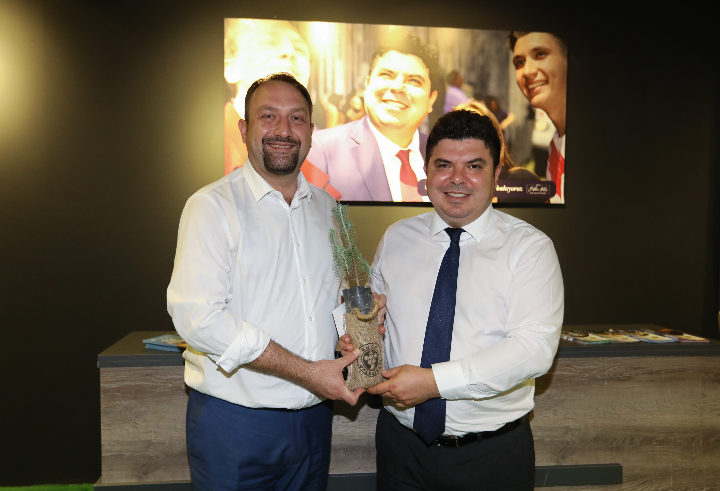 BAŞKANLARA FİDAN JESTİ Fuarda çam fidanlarının dağıtımını gerçekleştiren Buca Belediye Başkanı Av. Erhan Kılıç, ziyaretçilere çevre mesajları verirken fuara katılan belediye başkanlarına da fidan dağıttı. Yeşil alanların korunması ve arttırılması için duyarlılık çağrısı yapan Erhan Kılıç, belediye başkanlarına hediye ettiği fidanları belediye binaları önüne dikmelerini rica etti.