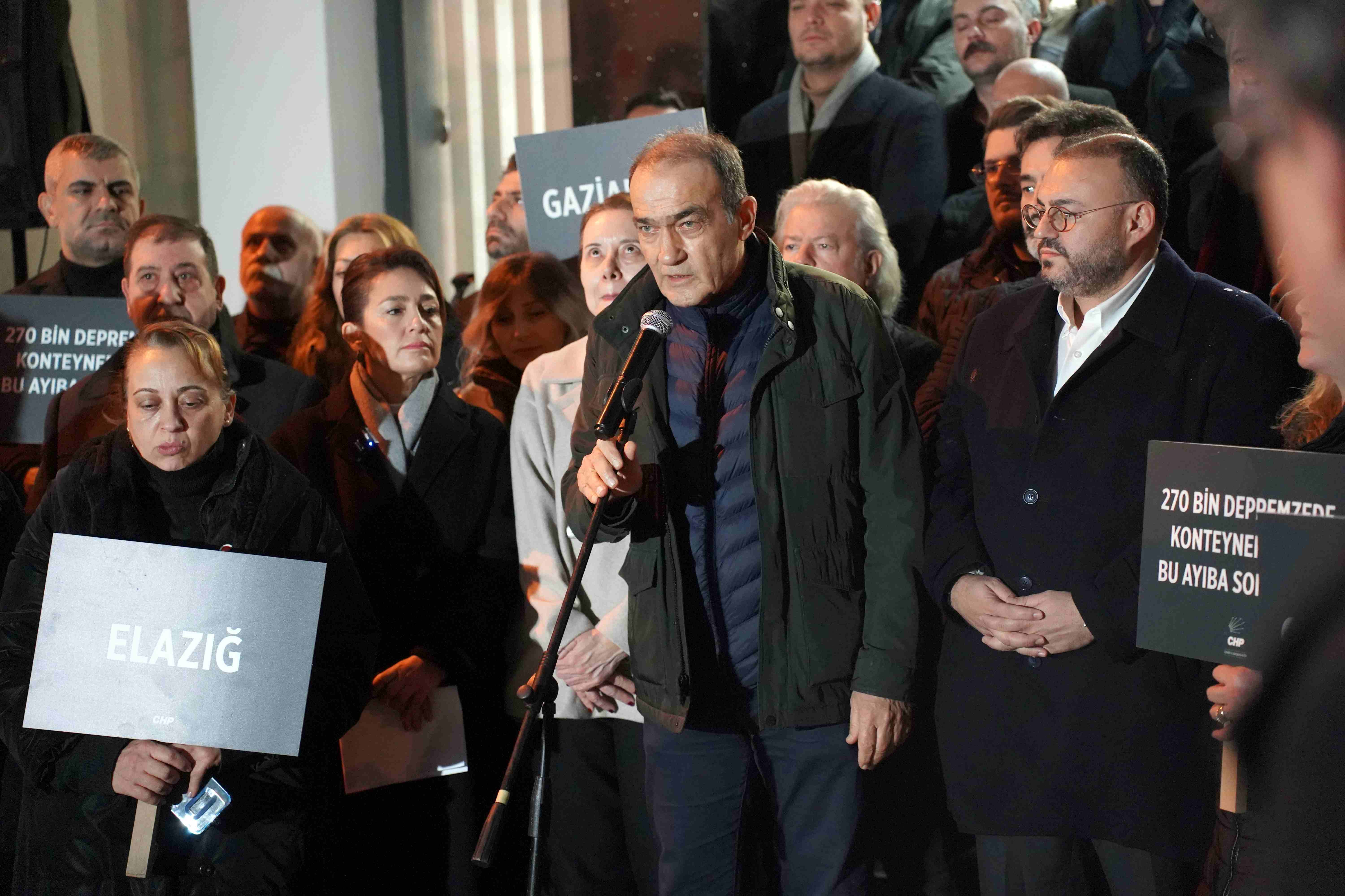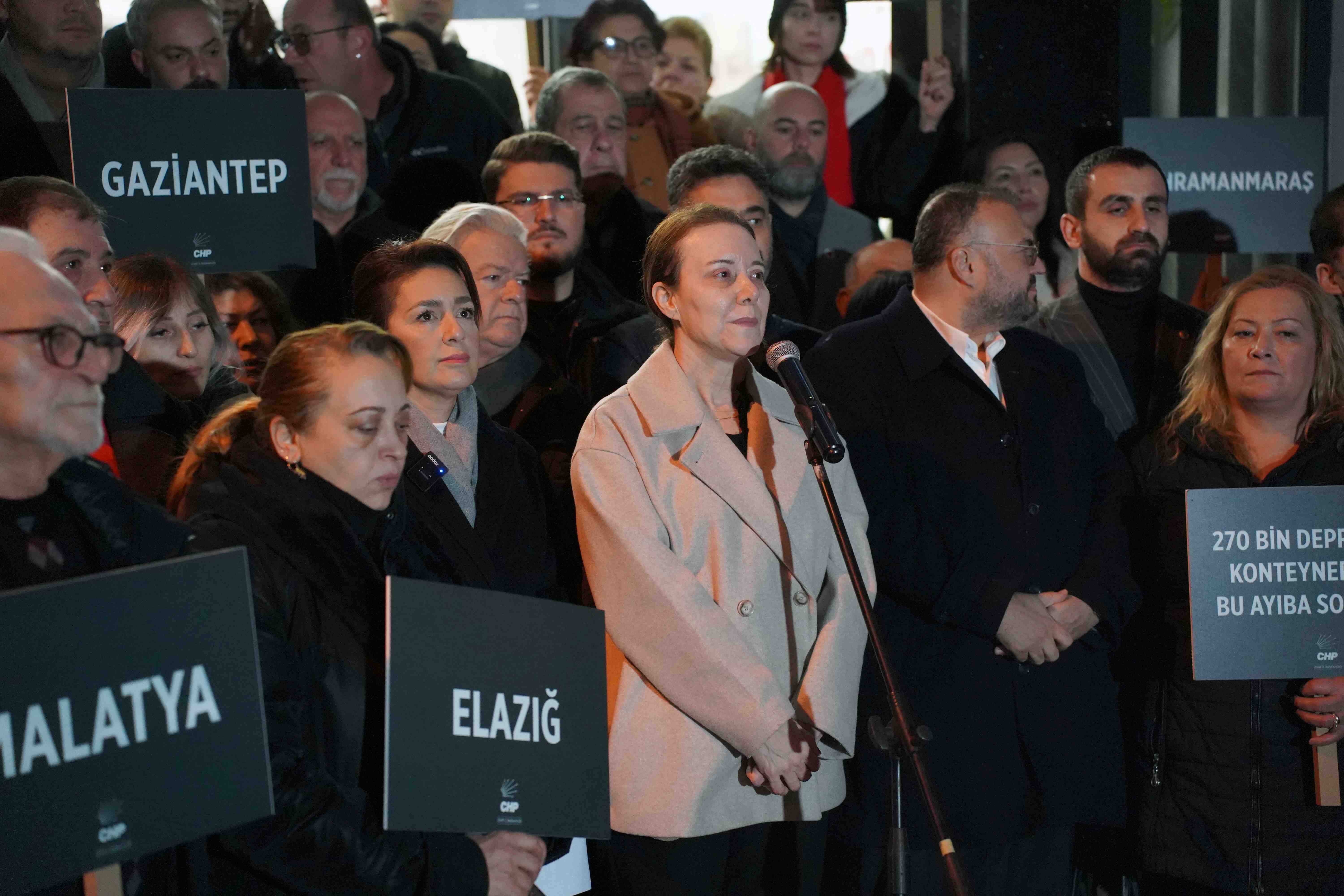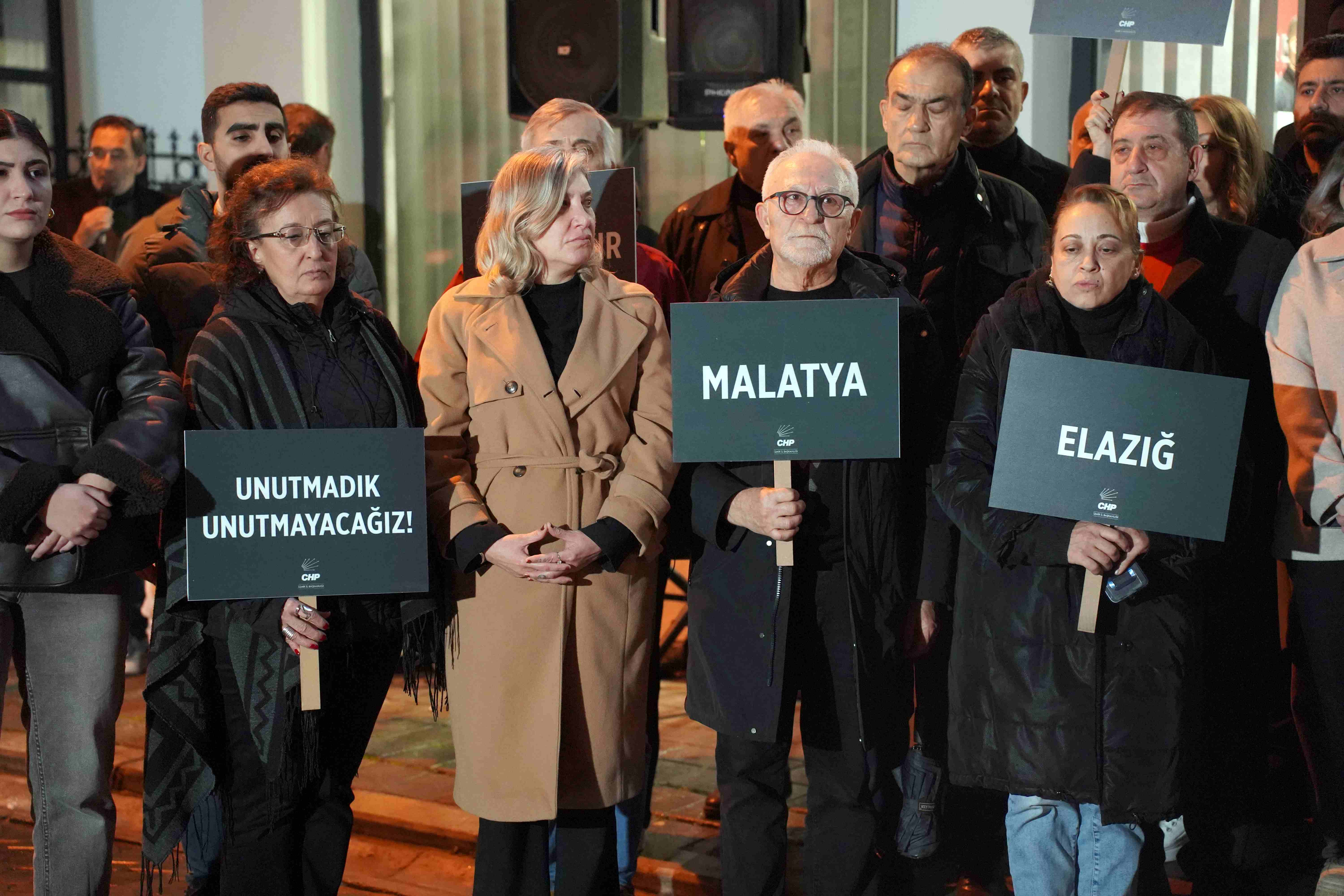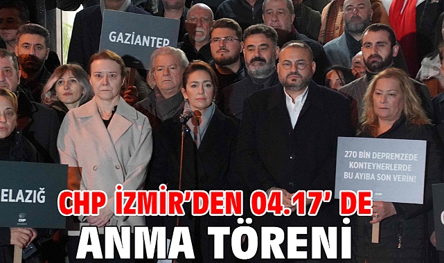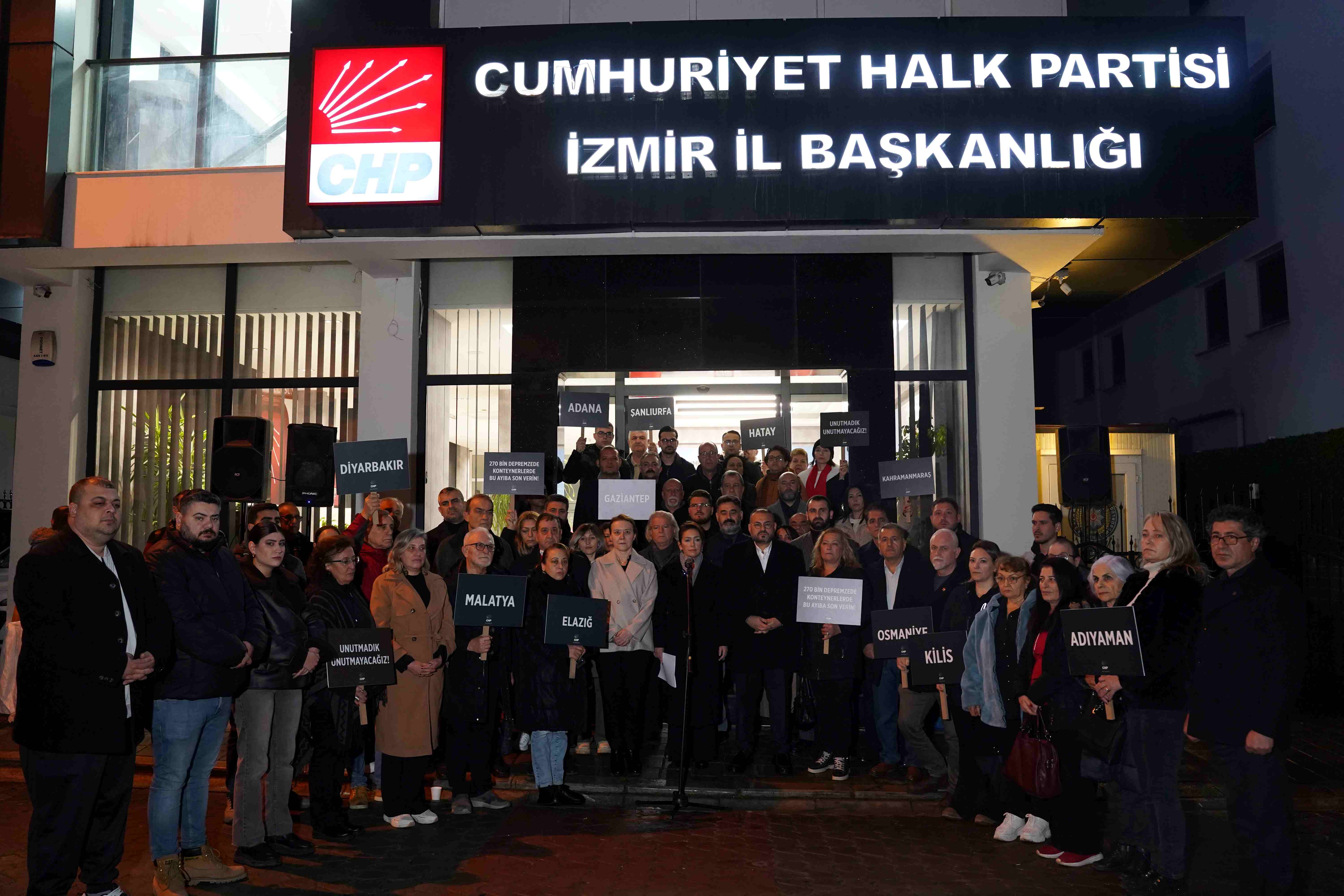 CHP İzmir İl Başkanlığı önünde İlk depremin yaşandığı sabaha karşı 04.17’de yapılan ve saygı duruşu ile başlayan törene CHP İzmir İl Yönetim Kurulu, İzmir Büyükşehir Belediye Başkan Vekili Zafer Levent Yıldır, CHP Konak İlçe Başkanı Serkan Kalmaz, Konak Belediye Başkanı Nilüfer Çınarlı Mutlu, parti üyeleri ve vatandaşlar katıldı. Törene katılanlar ellerinde depremden etkilenen illerin isimleri ve “270 bin depremzede konteynerlerde yaşıyor bu ayıba son verin” yazan dövizler taşıdı.
