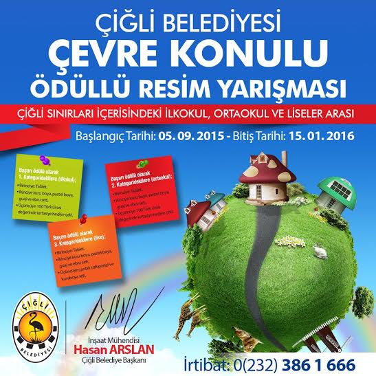 “Çevre bilinci şart”Çocuklara çevre bilincinin aşılanması için her platformu değerlendirmeye çalıştıklarını belirten Çiğli Belediye Başkanı Hasan Arslan, öğrencilerin yarışmaya katılımını beklediklerini söyledi. Resimlerin gelmeye başladığını belirten Başkan Arslan duyuruyu okullarda yaptıklarını belirterek, “Tüm okullarımıza yarışmamız hakkında bilgi verdik. 16 Ocak tarihine kadar başvuruları bekliyoruz. Öğrencilerimizin duyarlı olduğunu biliyorum ama biz bunu daha da perçinlemek istiyoruz” diye konuştu.