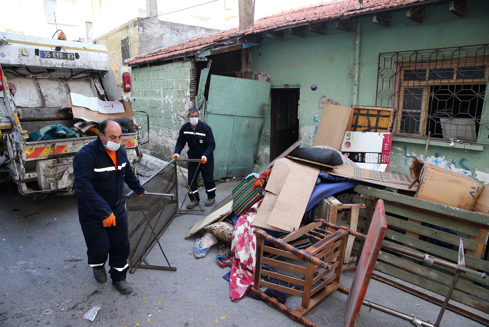 YOĞUN ÇALIŞMALAR SONUÇ VERDİİzmir’de günde 650 ton ile en fazla çöpü toplayan ilçe belediye olan Konak Belediyesi, aynı zamanda çöp ve moloz yığınlarıyla dolu olan yapıları da bir bir temizliyor. Zabıta ekiplerinin destek verdiği temizlik çalışmaları kapsamında son olarak Anadolu Mahallesi 2431 Sokak'ta çöp eve dönüşen metruk bir binayı pislik ve moloz yığınından kurtardı. Uzun zamandır boş durduğu için kimliği belirsiz kişiler tarafından mesken haline getirilen bina, Temizlik İşleri Müdürlüğü’ne bağlı ekiplerin saatler süren uğraşları sonucu temizlendi. Sabahın erken saatlerinde başlayan çalışmalar sonunda bina içinde biriken ve çevreye pis kokular yayan çöpler boşaltıldı. Çöp evden çok sayıda eski ev eşyası, giysi, pet şişe, teneke kutu, kağıt ve boş içki şişesi çıkarıldı. Evden çıkan atıklar görevliler tarafından kamyonlara yüklenerek, bertaraf edilmek üzere götürüldü. Boşaltılan çöp ev ilaçlanarak, dezenfekte edildi.