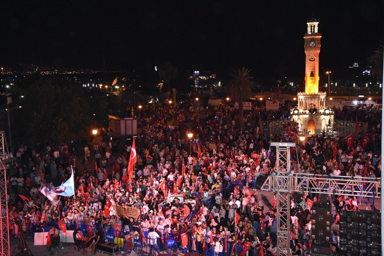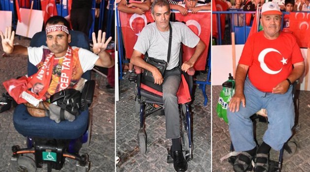 Cumhurbaşkanı Recep Tayyip Erdoğan'a destek vermek viçin günlerdir Konak Meydanı'na geldiğini belirten engelli vatandaş Enes Yaradanakul, "Eğer tanklarİzmir'de de sokaklara çıksaydı, engelli arabamla tankın önüne geçerdim" dedi. Bir diğer engeli Hakan Aydın ise, "Burası bizim vatanımız, sonuçta burası Türkiye. Yarın öbür gün tekrar herhangi bir şey olursa yine aynı şekilde biz millet olarak yine sokaklara döküleceğiz" diye konuştu.(dha)