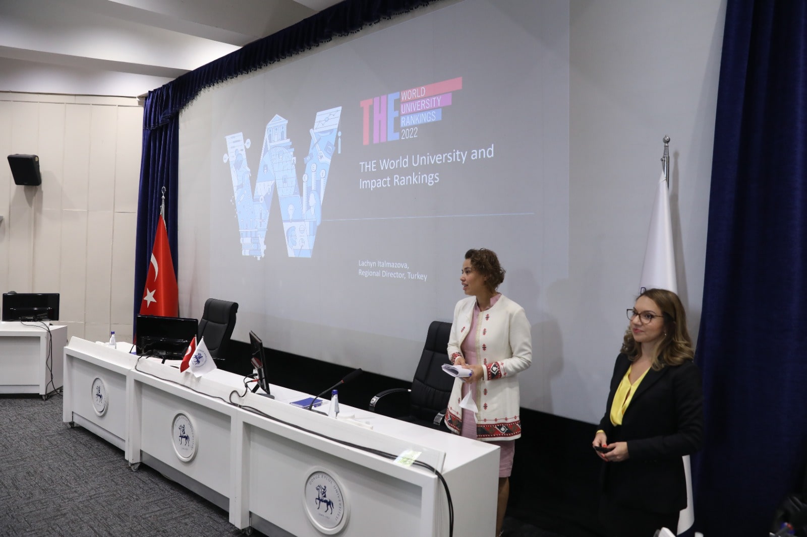 Uluslararası saygınlığını artırma yolunda çalışmalarını ve iş birliklerini sürdüren Dokuz Eylül Üniversitesi (DEÜ), ‘Dünyada ilk 500’ hedefi doğrultusunda, dünyanın önde gelen yükseköğretim derecelendirme kuruluşlarından Times Higher Education’nın (THE) Direktörü Lachyn Italmazova’yı konuk etti. THE Direktörü Italmazova; DEÜ Rektörü Prof. Dr. Nükhet Hotar’ın yanı sıra birim yöneticileri ve akademisyenlerin de katıldığı “THE Dünya Üniversiteler ve Etki Sıralamları” (THE World University and Impact Rankings) başlıklı sunumunda, kuruluşun üniversiteleri sıralamada kullandığı yöntem ve kriterler hakkında bilgilendirmede bulundu. Italmazova, 11 ana başlığa ayrılan sunumda, kuruluşun dünden bugüne ortaya koyduğu çalışmalarla birlikte; 3 bin 500 üniversitenin verileri ışığında yapılan araştırma metrikleri, üniversitelerde öngörülen değişiklikler gibi konularda detaylı bilgiler verdi. Akademisyenlerin interaktif katılımıyla süren toplantıda, DEÜ Rektörü Prof. Dr. Nükhet Hotar da yaptığı konuşmada önemli mesajlar verdi.