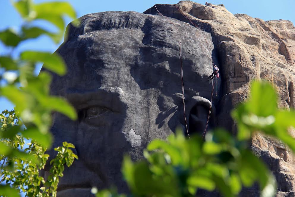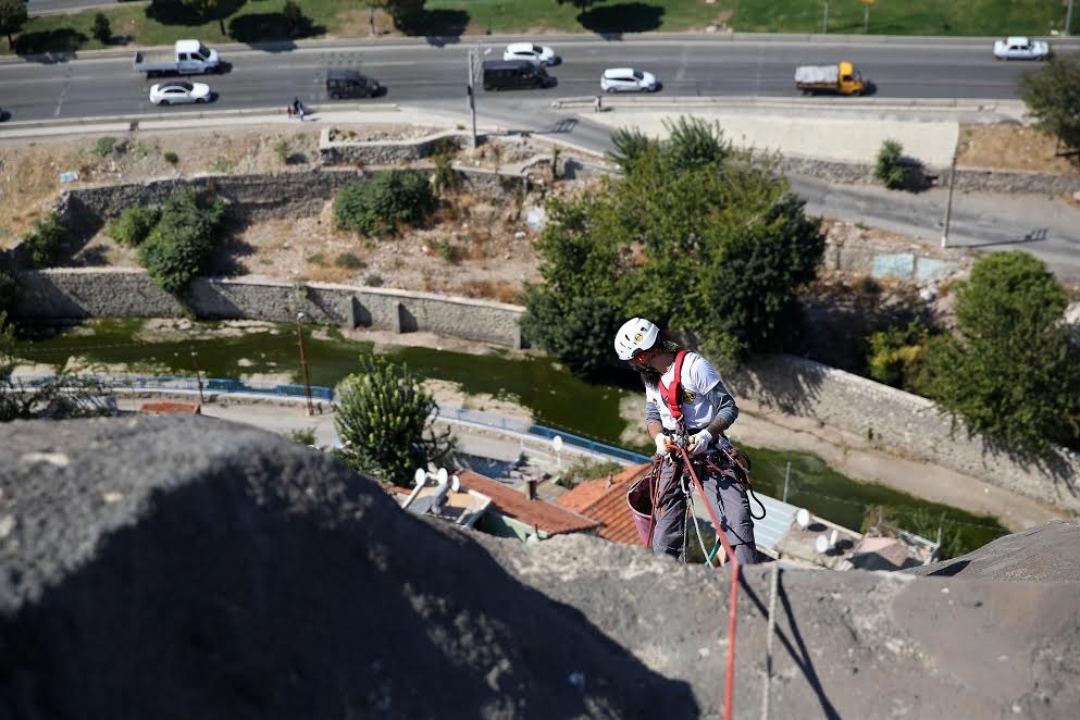 Buca Belediyesi, Buca Çaldıran Mahallesi çevre yolu güzergahına bakan kayalıklarda konumlanan Atatürk maskının bulunduğu alana vinç girememesi nedeniyle bakım ve tamirat işlemleri için özel bir dağcılık ekibinden destek alıyor. Maskın hava şartlarından zarar gören yanak, kulak ve kaş bölgelerine ulaşmak için iplerle maska inen dağcı ekipler, inceleme ve tespit çalışmalarının ardından boyama çalışmalarına başladı.