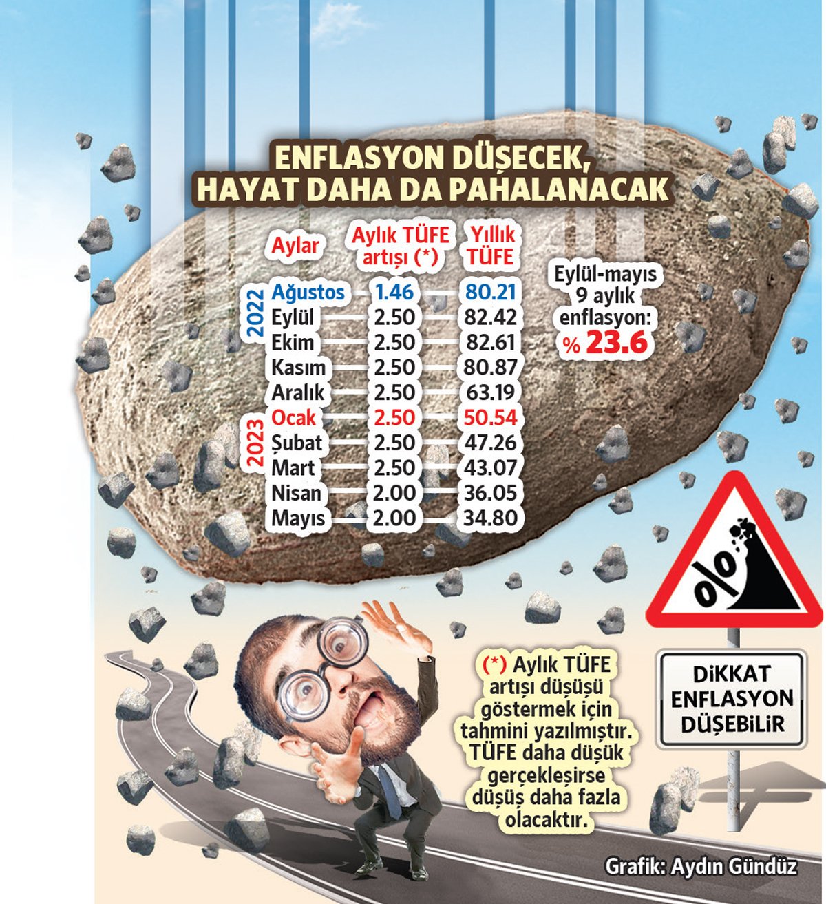Önümüzdeki dönemde yıllık enflasyon hesaplanırken yüzde 13'leri aşan aylık enflasyonlar hesaptan çıkacak, onların yerine yüzde 1, yüzde 2 ya da yüzde 3'ler civarındaki aylık enflasyonlar girecek. Baz etkisiyle yıllık enflasyon hızla düşecek. Örneğin aylık enflasyon eylül-mart arasında her ay yüzde 2.5, nisan ve mayısta yüzde 2'şer artarsa, 9 aylık enflasyon artışı yüzde 24'ü bulacak. Ancak ekimde yüzde 83'leri görecek yıllık enflasyon kasımda yüzde 63, ocakta yüzde 50, martta yüzde 43 ve mayıs ayında yüzde 35'in altına inecek. Seçmen seçimlere sözde ‘beli kırılmış enflasyonla' girerken hayat pahalılığı devam edecek.