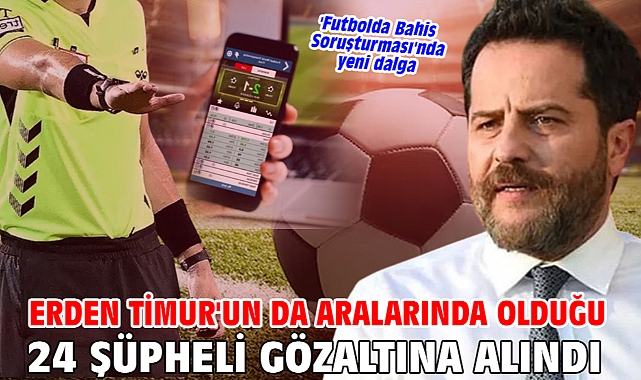 Cumhuriyet Başsavcılığı tarafından yürütülen 'Futbolda Bahis Soruşturması kapsamında eski Galatasaray Spor Kulübü yöneticisi Erden Timur'un da aralarında olduğu 14'ü futbolcu 29 şüpheli hakkında gözaltı kararı verildi. Sabah saatlerinde 11 ilde düzenlenen eş zamanlı operasyonla Erden Timur dahil 24 şüpheli gözaltına alındı. Bir şüphelinin başka suçtan cezaevinde olduğu tespit edilirken 4 şüpheliyi ise yakalanma çalışmaları devam ediyor. (DHA)