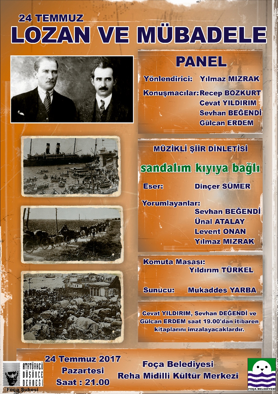 ‘‘Lozan ve Mübadele’’ isimli panel ve ‘‘Sandalım Kıyıya Bağlı’’ isimli müzikli şiir dinletisi, 24 Temmuz 2017 Pazartesi günü, Foça Belediyesi Reha Midilli Kültür Merkezi’nde, saat 21.00’de başlayacak.