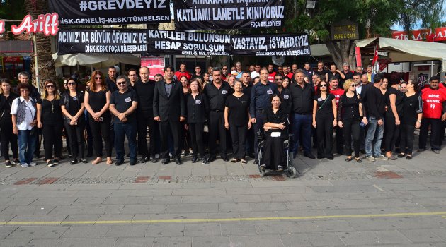 13 Ekim Salı günü, Foça Demokrasi Meydanı’nda toplanan grevciler adına konuşma yapan Levent Mısır, “Zor günlerden geçiyoruz. 10 Ekim 2015 tarihimize kara bir leke olarak yazılmıştır. Ankara katliamını, Disk, Genel-İş, Tesk ve Tümbel-Sen’e bağlı Foça Belediyesi çalışanları olarak lanetliyoruz!... Yastayız, Grevdeyiz” dedi.