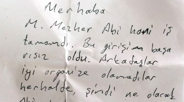 "Mezher abi hani iş tamamdı. Bu girişim başarısız oldu. Arkadaşlar iyi organize olamadılar herhalde, şimdi ne olacak. Abi, başka bir girişim var mı? Bizler buralarda ne yapabiliriz. Bizlere inşallah burada bir sıkıntı yapmazlar. Abi sizler de kendinize dikkat edin, Abilere selamlar. Abi okuduktan sonra notu lavaboda yakın."