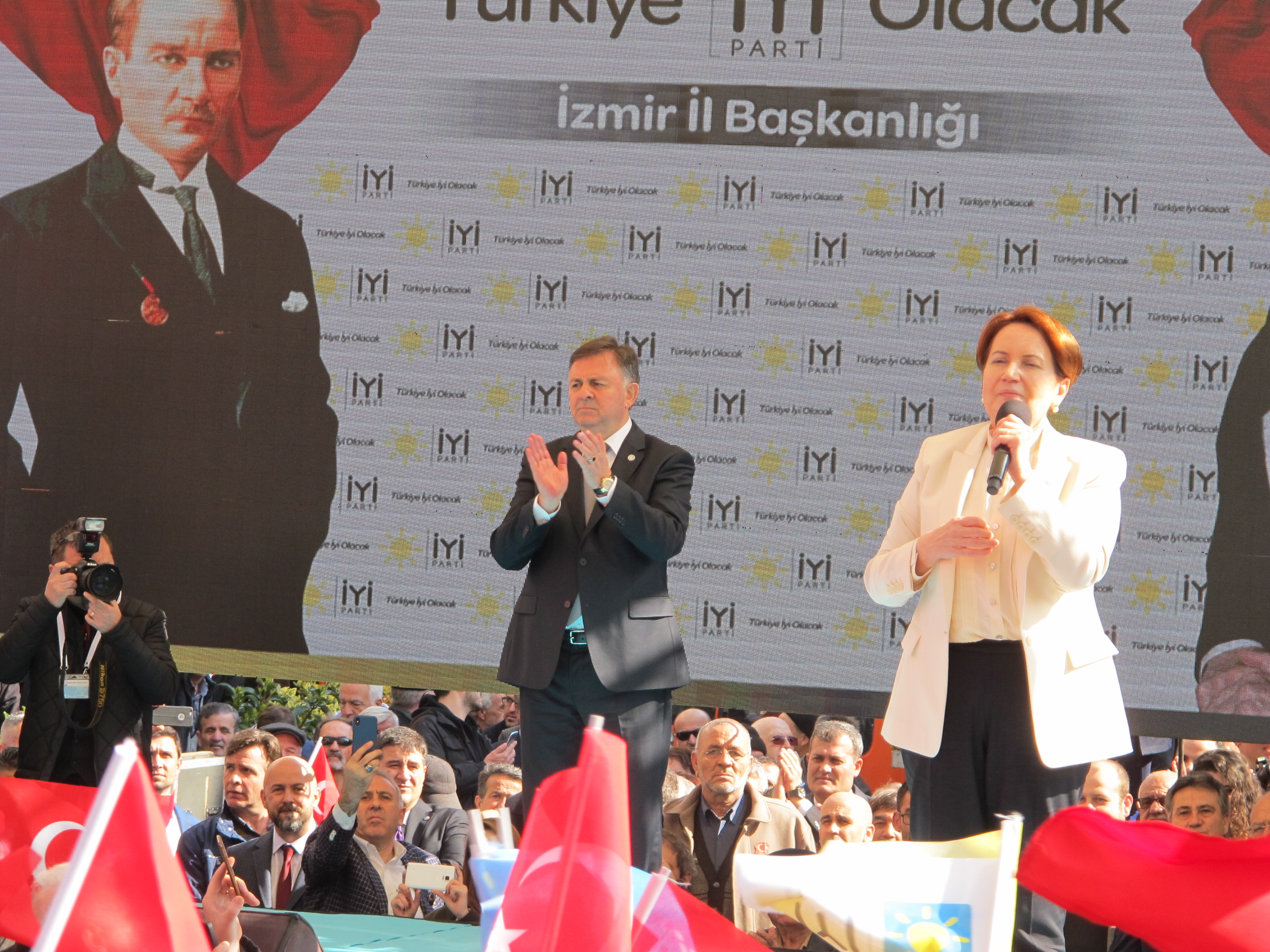 “İzmir umut veriyor”“İzmir bize 2 buçuk yıllık süreçte her daim önce umut, irade, cesaret ve sonra kararlılık verdi” diyerek konuşmasını sürdüren Akşener, “İzmir’e her geldiğimde inancım ve ümidim artarak bu yolda yeniden dimdik yürüdük. Allah İzmirlilerden razı olsun. İzmir sahte Atatürkçülere, sahte kabadayılara yeter söz İzmir’indir diyen İzmir’dir. Allah sizleri var etsin. Allah sizleri her daim mutlu, mesut ve muzaffer kılsın. Siz ki Zübeyde Hanım’ın yetim Mustafa’sına sahip çıtkınız. Siz kim yetim Mustafa’nın validesine sahip çıktınız. Size söz veriyorum. Aynı sizin sahip çıktığınız gibi yetim Mustafa’nın kurduğu cumhuriyete sonuna kadar neye mal olursa olsun sahip çıkacağımıza ve onun arkasında dimdik duracağımıza söz veriyoruz. Cesur İzmir. Tehdide pabuç bırakmayan İzmir. Hakarete dimdik ayağa kalkıp cevap veren İzmir. Onurlu bir şekilde demokrasi kurallarına uyarak dimdik ayağa kalkıp dur diyen İzmir. Aynı Çanakkale Savaşı esnasında dur yolcu denildiği gibi. Dün dur yolcu dediniz, bugün de cumhuriyetin bekçisiyiz diyorsunuz” açıklamasında bulundu.