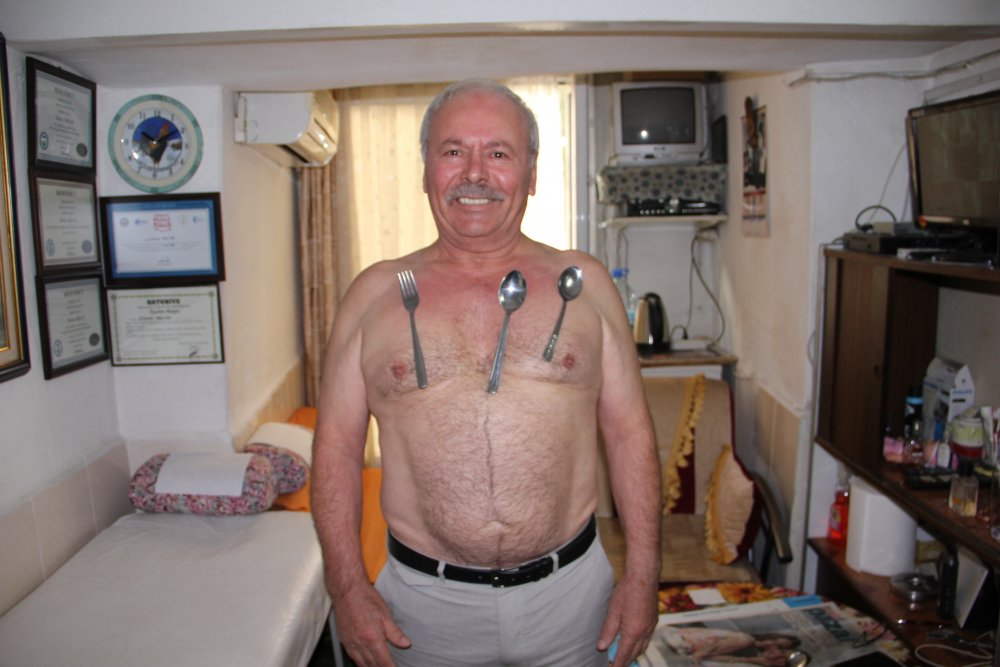 Ethem Arslan'ın vücuduna çatal, kaşık, bıçak, madeni para, tepsi gibi madeni eşyaların yanı sıra cep telefonu gibi çeşitli elektronik eşyalar da yapışıyor.İzmir'deki Basmane semtinde otel