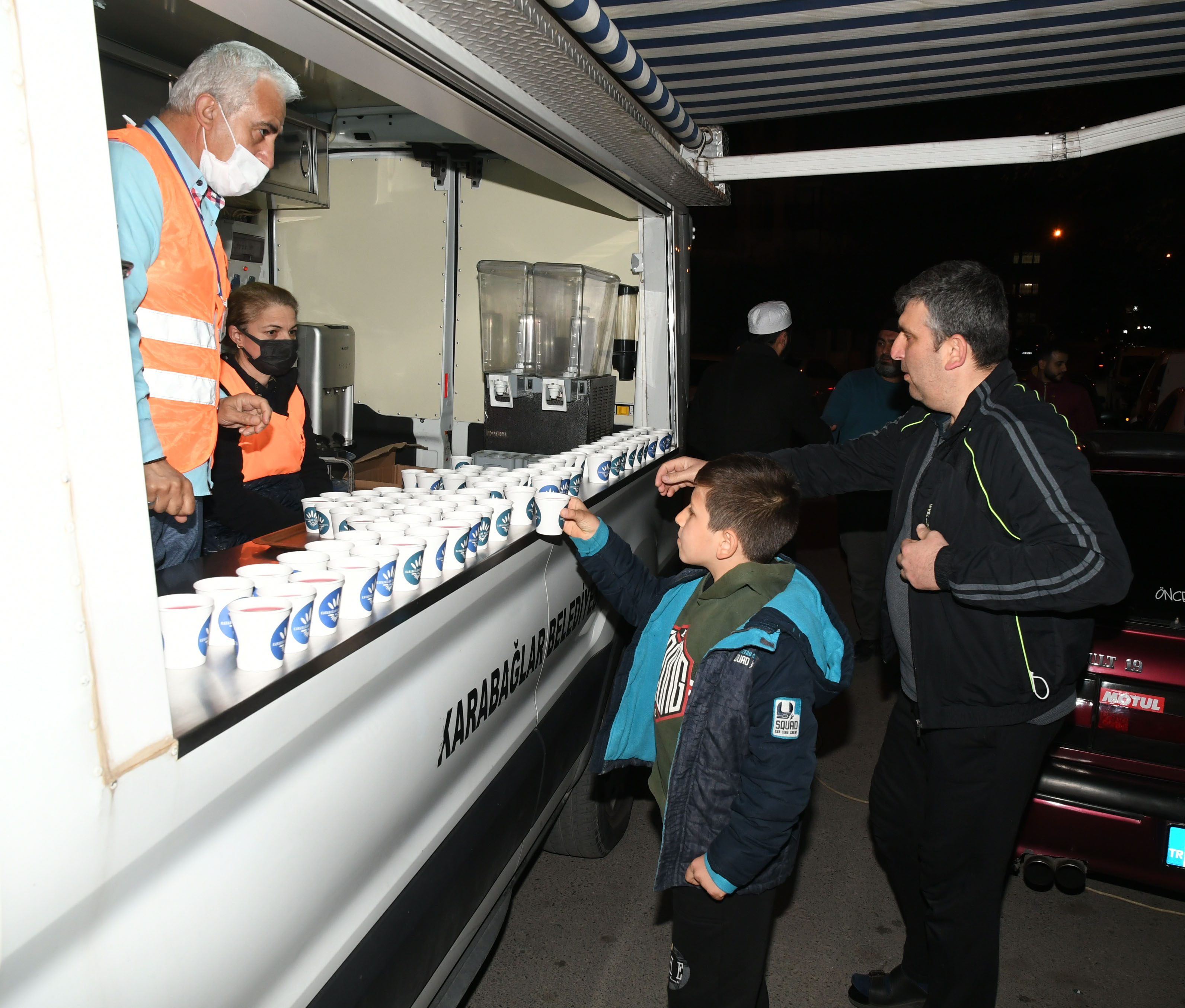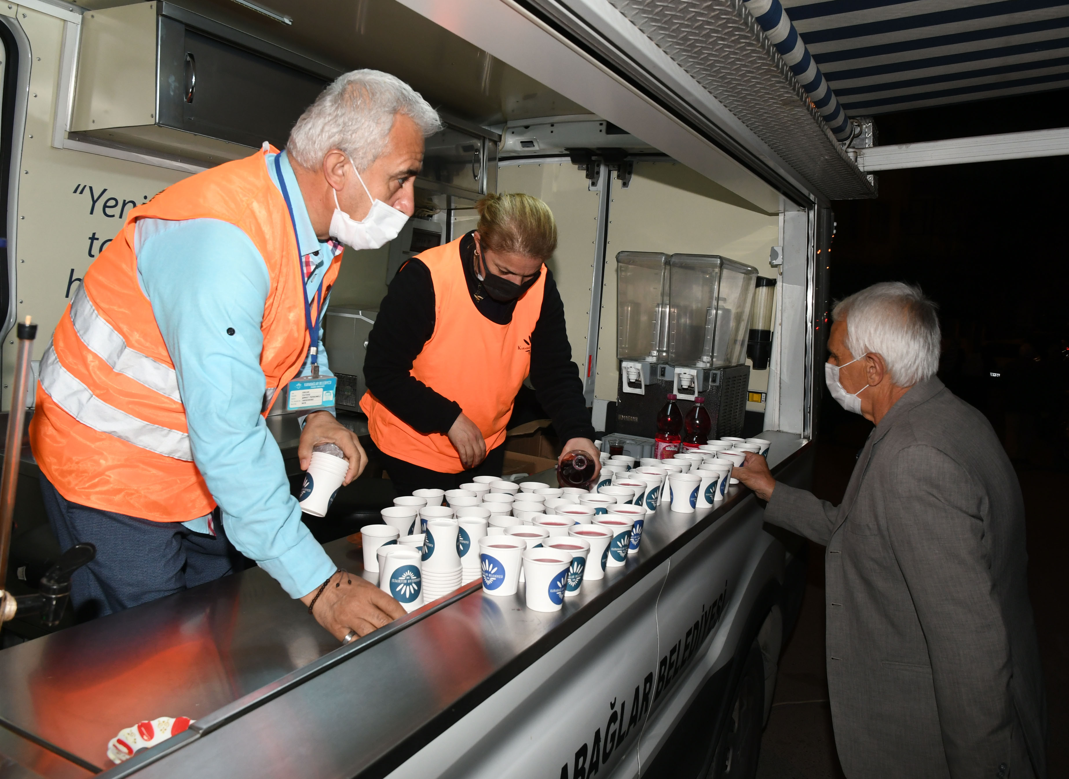 Ramazan nedeniyle ilçede bulunan 85 camii ve mescidin daha temiz olması, vatandaşların sağlıklı bir ortamda ibadetlerini yapması için temizlik çalışmaları gerçekleştiren Karabağlar Belediyesi, cami önlerine de ikram araçları koydu. Bu araçlardan, teravih namazından çıkan vatandaşlara şerbet ikram ediliyor.