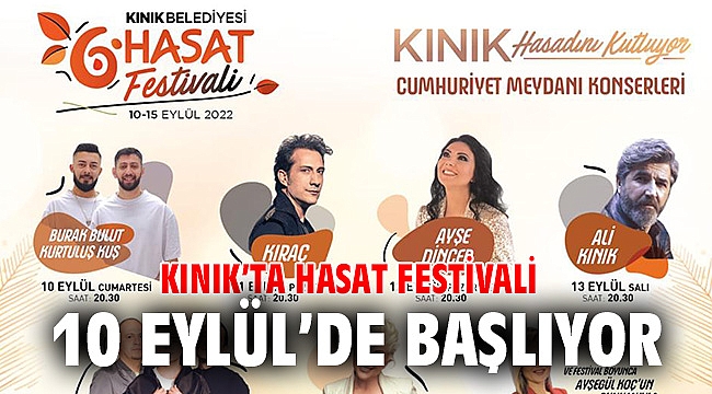 Kınık Belediyesi tarafından bu yıl 6’ncısı düzenlenecek olan Hasat Festivali ve Kurtuluş günleri etkinlikleri 10-15 Eylül tarihleri arasında gerçekleştirilecek. Etkinlikler kapsamında Ali Kınık, Muazzez Ersoy, Kıraç, Burak Bulut, Kurtuluş Kuş, Zakkum ve Ankaralı Ayşe konserleri de yapılacak.