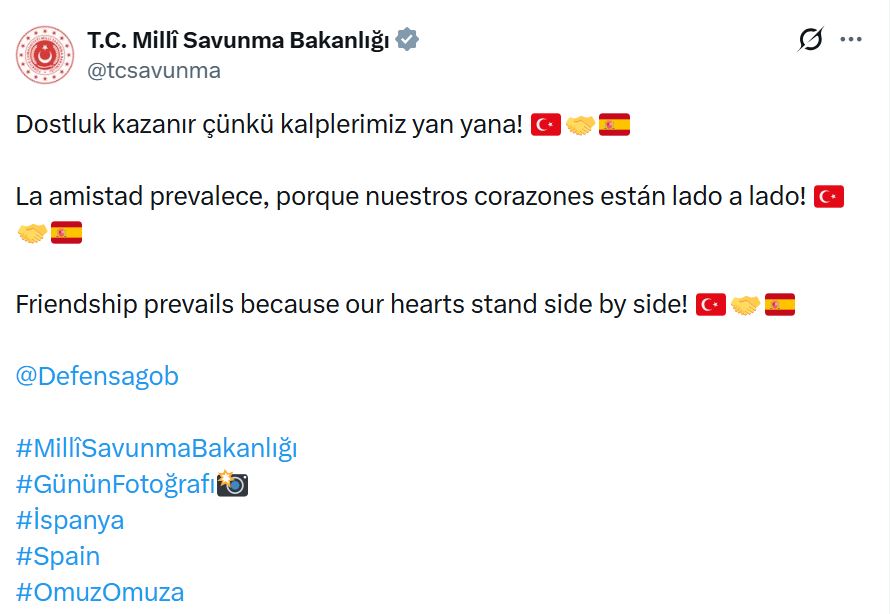 Bakanlığın sanal medya hesabından 'günün fotoğrafı' etiketiyle Türk askeri ve İspanya askerinin yan yana çekilen fotoğrafı paylaşıldı. Almanya'da gerçekleştirilen Steadfast Dart 2026 Tatbikatı'nda iki askerin aynı mevzide birlikte nişan alırken çekilen ve 'Omuz omuza' etiketiyle paylaşılan fotoğraf, beğeni kazandı. Paylaşımda, 'Dostluk kazanır çünkü kalplerimiz yan yana' notuna da yer verildi. (DHA)