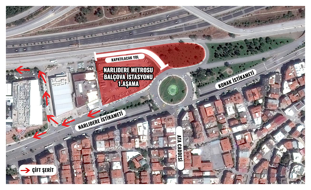 Trafikte geçici düzenlemelerDevam eden çalışmalar kapsamında açılacak TBM şaftı ve Balçova istasyonunun yapımı için, UKOME Kararı uyarınca hat güzergahının bazı bölümlerinde trafik düzenlemeleri yapılacak. İki aşamada gerçekleşecek trafik düzenlemesinin birinci aşamasında, Balçova Ata Caddesi giriş kavşağında Mithatpaşa Caddesi’ni Mustafa Kemal Sahil Bulvarı'na bağlayan yan yolun bir kısmı araç trafiğine kapatılacak. İlk aşama trafik düzenleme çalışmaları 14 Temmuz Cumartesi akşamından itibaren başlayacak.