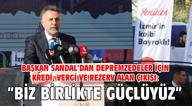 CHP Genel Başkanı Kemal Kılıçdaroğlu’nun katılımıyla gerçekleşen Halk Konut temel atma töreninde konuşan Bayraklı Belediye Başkanı Serdar Sandal, depremzedeler için kredi ve rezerv alan çıkışında bulundu. Depremzedelerin biriken emlak vergilerinin silinmesi için de çağrıda bulunan Başkan Sandal, “Büyükşehirimizin destekleriyle ilk andan bugüne kadar üzerimize düşeni yaparak her zaman depremzedelerimizin yanında olduk. Dileğimiz ihtiyaç kadar uygun kredinin verilmesi, biriken emlak vergilerinin silinmesi ve rezerv alanın deprem mağdurlarımıza tahsis edilmesidir” dedi. CHP liderine seslenen Sandal, “Bayraklı ve İzmir olarak sonuna kadar yanınızda olacağımıza söz veriyoruz” diyerek sözlerini tamamladı.