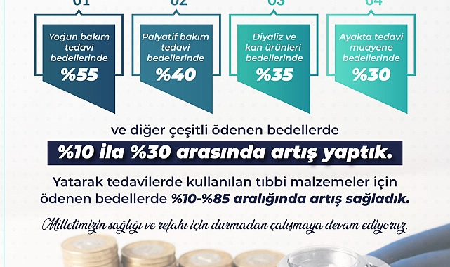 Sosyal Güvenlik Kurumu (SGK) sosyal medya hesabından yapılan paylaşımda, genel sağlık sigortalıların aldıkları tedaviler karşılığında hastanelere ödenen bedellerde artışa gidildiğini açıkladı. Buna göre;Tedavilere ilişkin karşılanan bedellerde yüzde 10 ila yüzde 55 oranında, yatarak tedavilerde kullanılan tıbbi malzemelerin bedellerinde yüzde 10 ila yüzde 85 oranında artış gerçekleştirildi.Bu düzenlemelerle, bedeli karşılanan sağlık hizmetlerinde toplam 110 milyar TL tutarında iyileştirme sağlandığı belirtilen açıklamada, “Herkes için daha erişilebilir sağlık hizmeti sunmak için durmaksızın çalışıyoruz” ifadeleri kullanıldı.BAKAN IŞIKHAN’DAN PAYLAŞIMÇalışma ve Sosyal Güvenlik Bakanı Vedat Işıkhan, sağlık hizmetlerinde yapılan iyileştirme hakkında sosyal medya hesabından açıklama yaptı. Işıkhan açıklamasında, “Vatandaşlarımızı dünya standartlarında daha etkin ve kapsamlı hizmetler ile buluşturmak için yayımlanan Sağlık Uygulama Tebliği (SUT) sayesinde önemli bir iyileştirmeyi tamamlamış olduk. Hayata geçirdiğimiz bu önemli adım için Sayın Cumhurbaşkanımıza şükranlarımı sunuyorum. Sağlık Bakanımız Sayın Prof. Dr. Kemal Memişoğlu ile Hazine ve Maliye Bakanımız Sayın Mehmet Şimşek’e göstermiş oldukları hassasiyet ve destek için teşekkür ediyorum” dedi. (DHA)