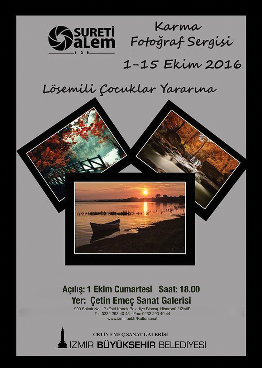 Bu ayki takvimde 1-15 Ekim 2016 tarihleri arasında çok anlamlı bir sergi yer alıyor. Sureti Alem Fotoğraf ve Sinema Sanatı Derneği tarafından lösemili çocuklar yararına düzenlenen karma fotoğraf sergisi, 1 Ekim 2016 Cumartesi günü saat 18.00’de Çetin Emeç Sanat Galerisi’nde görücüye çıkacak.Aynı gün saat 20.00’de ise fotoğraf sanatçısı Cem Demirel’in eserlerinden oluşan “Kişi’nin” başlıklı portre fotoğraf sergisi Tarihi Havagazı Fabrikası Kültür Merkezi’nde açılacak. Serginin küratörlüğünü İlknur Güneş üstlenirken, sergide sanat danışmanı olarak Deniz Can’ın imzası bulunuyor. Görsel editör ise Berkin Öğüt. Sergi 11 Ekim’e kadar açık kalacak.