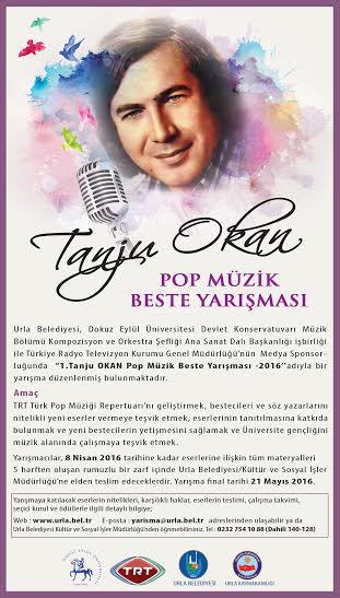 Urla Belediyesi, Dokuz Eylül Üniversitesi Devlet Konservatuvarı Müzik Bölümü Kompozisyon ve Orkestra Şefliği Ana Sanat Dalı Başkanlığı işbirliğiyle ve Türkiye Radyo Televizyon Kurumu Genel Müdürlüğü’nün medya sponsorluğunda “1.Tanju OKAN Pop Müzik Beste Yarışması – 2016”için geri sayım başladı.SON BAŞVURU TARİHİ 8 NİSANUrla Kaymakamlığı desteğiyle bu yıl ilki gerçekleşecek olan yarışmanın son başvuru tarihi 8 Nisan 2016 olarak belirlendi. TRT Türk Pop Müziği Repertuarı’nı geliştirmek, bestecileri ve söz yazarlarını nitelikli yeni eserler vermeye teşvik etmek, eserlerinin tanıtılmasına katkıda bulunmak ve yeni bestecilerin yetişmesini sağlamak, üniversite gençliğini müzik alanında çalışmaya teşvik etmek amacıyla gerçekleştirilen yarışmanın finali tarihi ise 21 Mayıs 2016 tarihinde olacak.