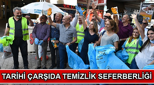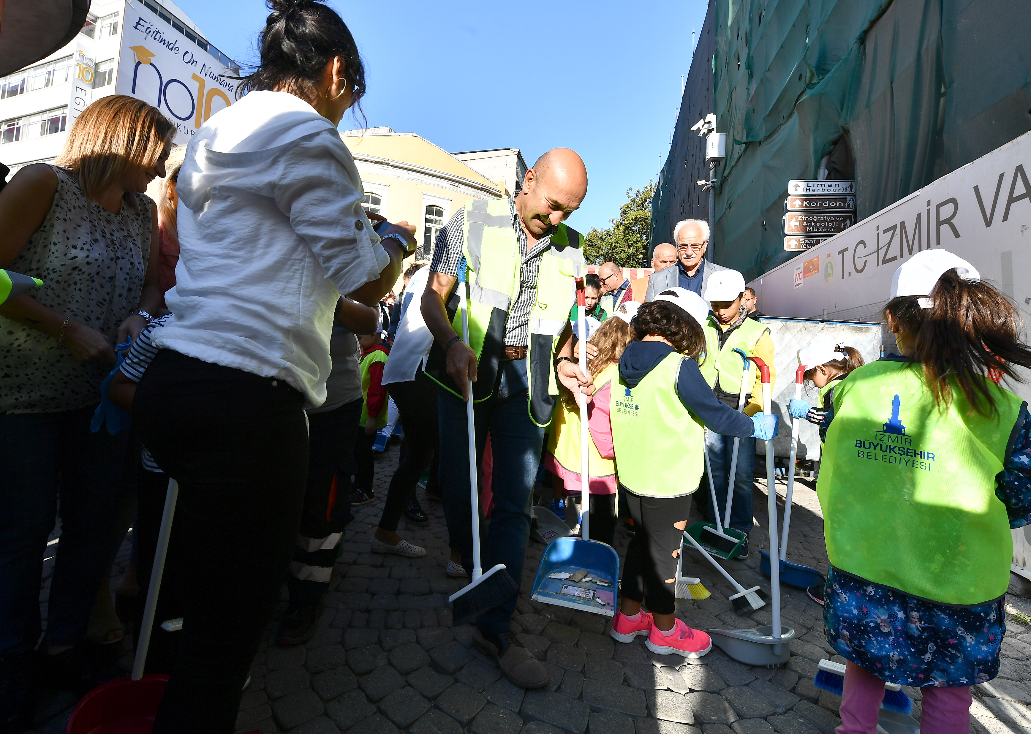 Bu hafta İzmir’in Konak ilçesindeki tarihi Kemeraltı Çarşısı’nda yürütülen temizlik çalışmalarına katılan İzmir Büyükşehir Belediye Başkanı Tunç Soyer, İZELMAN Ana Okulları’nın öğrencileriyle birlikte tarihi çarşıda temizlik yaptı. Mini süpürge arabasının şoför koltuğuna geçen Başkan Soyer “Yerde tek bir izmarit bile bırakmayacağız” dedi. Başkan Soyer’e, Konak Belediye Başkanı Abdul Batur, Narlıdere Belediye Başkanı Ali Engin, Bayraklı Belediye Başkanı Serdar Sandal, Karşıyaka Belediye Başkanı Cemil Tugay, Gaziemir Belediye Başkanı Halil Arda, CHP Konak İlçe Başkanı Çağrı Guruşçu, İzmir Büyükşehir Belediyesi bürokratları ve Kemeraltı esnafı d a destek verdi.