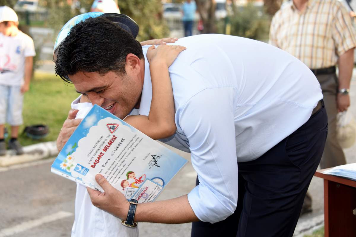 Aliağa Belediye Başkanlığı, İlçe Milli Eğitim Müdürlüğü ve Emniyet Müdürlüğü'nün birlikte yürüttüğü 'Trafikte 10 Bin Melek' projesi kapsamında aliağa belediyesi Çocuk Trafik Eğitim Okuluna yaz döneminde katılan öğrenciler başarı sertifikalarını aldı.5-12 yaş arasındaki çocukların hafta içinde üç gurupta eğitim aldığı 8. dönem yaz kursuna bu yıl 125 öğrenci katıldı. 2007 yılında 'Bugünün küçükleri, yarının sürücüleri' sloganı ile başlatılan uygulamalı trafik eğitimlerinde bugüne kadar 20 binden fazla çocuğa trafik eğitimi verildi.Yaz dönemi kursunu başarıyla tamamlayarak sertifika almaya hak kazanan öğrenciler için Aliağa Belediyesi Trafik Eğitim Okulu Eğitim Alanı'nda sertifika töreni düzenlendi. Törene aileleriyle birlikte katılan çocuklar başarı sertifikalarını Aliağa Belediye Başkanı Serkan Acar'ın elinden aldı. Öğrencilere başarı sertifikalarının yanı sıra bisiklet sürücü belgesi, trafik meleği kartı ve kitap hediye edildi. Sertifika töreninin ardından öğrenciler ve alileler Aliağa Belediye Başkanı Serkan Acar ile hatıra fotoğrafı çektirdi.