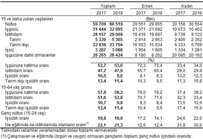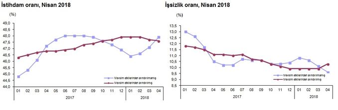 Türkiye genelinde 15 ve daha yukarı yaştakilerde işsiz sayısı 2018 yılı Nisan döneminde geçen yılın aynı dönemine göre 201 bin kişi azalarak 3 milyon 86 bin kişi oldu. İşsizlik oranı 0,9 puanlık azalış ile yüzde 9,6 seviyesinde gerçekleşti.İşsizlik oranı böylece 2016 Mayıs'tan bu yana ilk kez tek haneli rakamlara gerilemiş oldu. Aynı dönemde; tarım dışı işsizlik oranı 1 puanlık azalış ile yüzde 11,4 olarak tahmin edildi. Genç nüfusta (15-24 yaş) işsizlik oranı 2,9 puanlık azalış ile yüzde 16,9 olurken,15-64 yaş grubunda bu oran 0,9 puanlık azalış ile yüzde 9,8 olarak gerçekleşti.İSTİHDAM ORANI ARTIYORİstihdam edilenlerin sayısı 2018 yılı Nisan döneminde, bir önceki yılın aynı dönemine göre 852 bin kişi artarak 29 milyon 9 bin kişi, istihdam oranı ise 0,7 puanlık artış ile yüzde 47,9 oldu.Bu dönemde, tarım sektöründe çalışan sayısı 15 bin kişi azalırken, tarım dışı sektörlerde çalışan sayısı 868 bin kişi arttı. İstihdam edilenlerin yüzde 18,3’ü tarım, yüzde 19,5’i sanayi, yüzde 7,4’ü inşaat, yüzde 54,8’i ise hizmetler sektöründe yer aldı.Önceki yılın aynı dönemi ile karşılaştırıldığında tarım sektörünün istihdam edilenler içindeki payı 0,6 puan, inşaat sektörünün payı 0,4 puan azalırken, sanayi sektörünün payı 0,4 puan, hizmet sektörünün payı 0,5 puan arttı.
