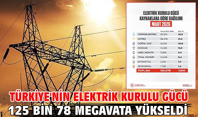 Türkiye’nin elektrik kurulu gücü, mart ayı sonu itibarıyla 125 bin 78 megavata yükseldi. Güneş kurulu gücünün toplam kurulu güç içerisindeki payı, 26 bin 478 megavat ile yüzde 21,2’ye ulaştı.